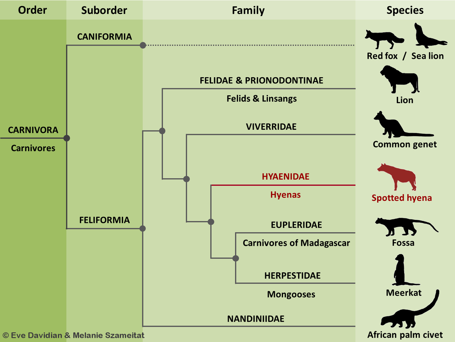 Spotted hyenas are most closely related to genets and mongooses. Despite their dog-like appearance, they do not belong to the dog branch (Caniformia) but to the cat branch (Feliformia).