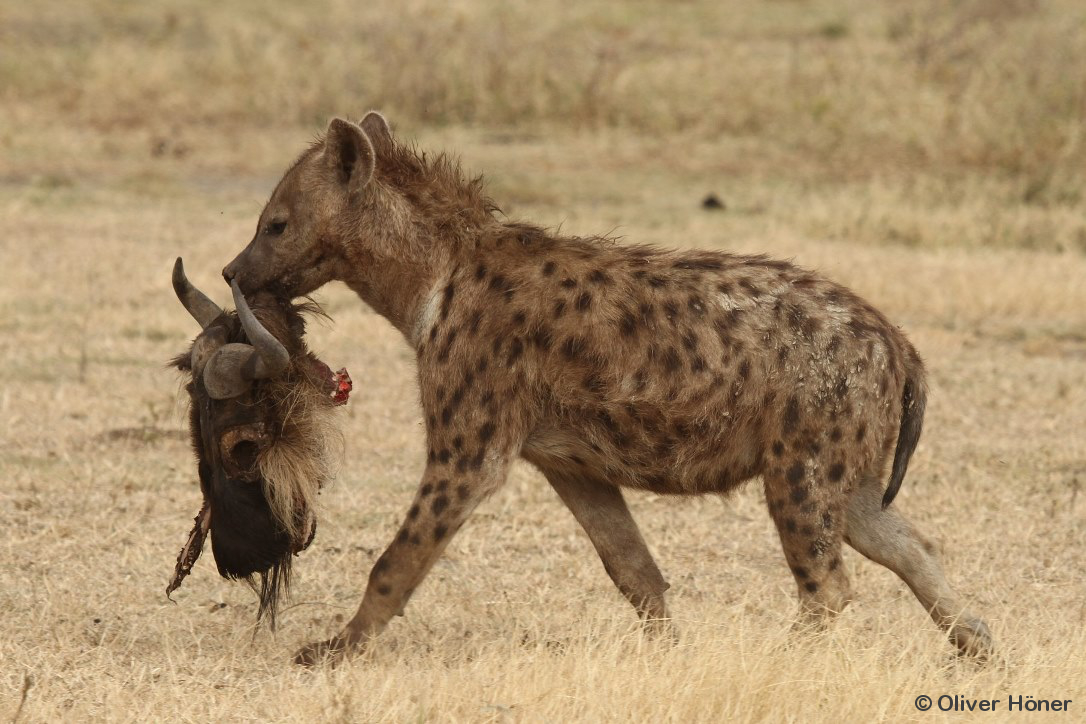 In the Ngorongoro Crater, wildebeests are the favourite prey of spotted hyenas. High-ranking mothers may carry remains of kills to the communal den to feed their young.