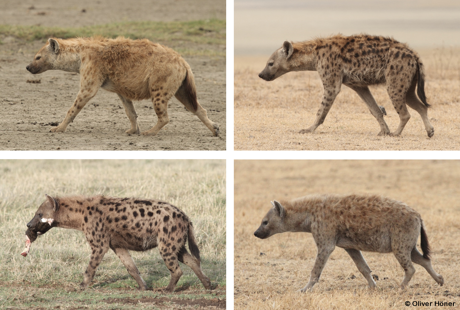 Every hyena has a unique spot pattern. Individual hyenas additionally differ in their fur style and colour. While some have short, blond fur with large dark spots, others have fluffy, reddish fur with fuzzy spots. Because an individual’s spot pattern does not change with age, these characteristics allow us to distinguish spotted hyenas from each other and identify them individually.