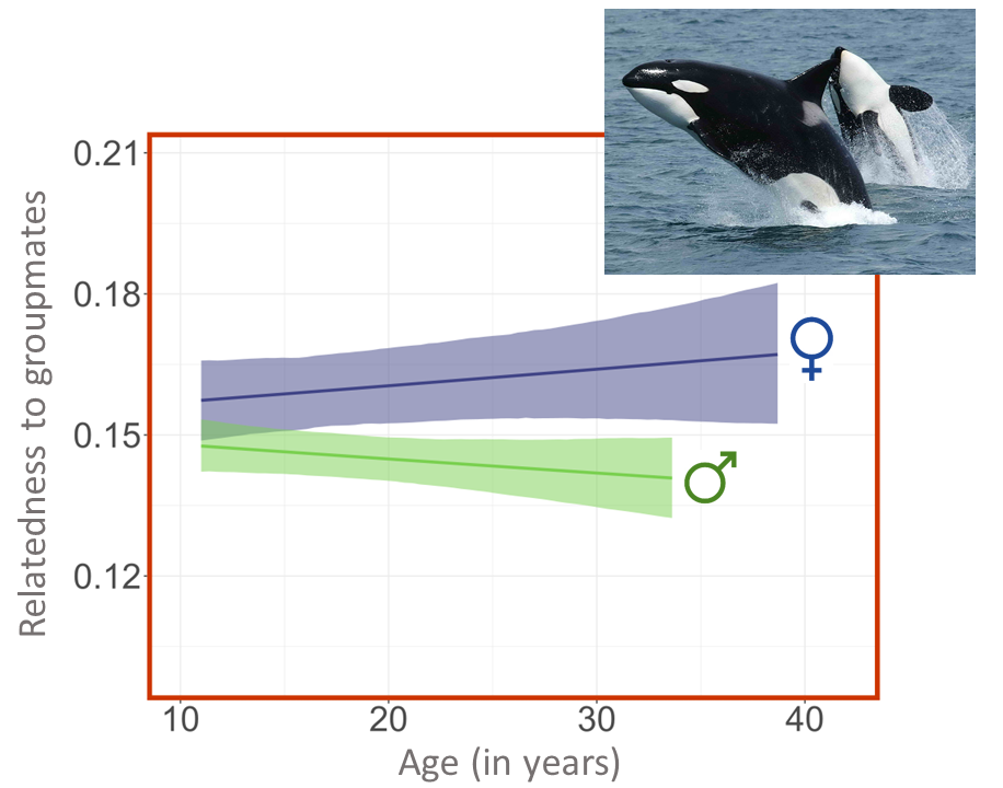 Kinship dynamics may explain why female killer whales go through menopause. In killer whales, neither sex disperses from their birth group (called a ‘pod’). Sons and daughters thereby both remain with their mother and adult females live among a growing number of offspring and grand-offspring as they age. This pattern was suggested to explain why old female killer whales – and possibly also women in humans – experience menopause as a ‘cooperative’ strategy to avoid the costs of competing with their daughters and grand-offspring (see study here). For male killer whales, patterns are reversed because of the “extra-group” mating system, which implies that males sire offspring with females that live in other pods. As a result, the offspring that are recruited in their pod are not closely related to the native males.