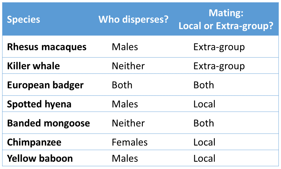 - Dispersal: Are some individuals (males, females, both, neither) more likely to leave their birth group when adult?